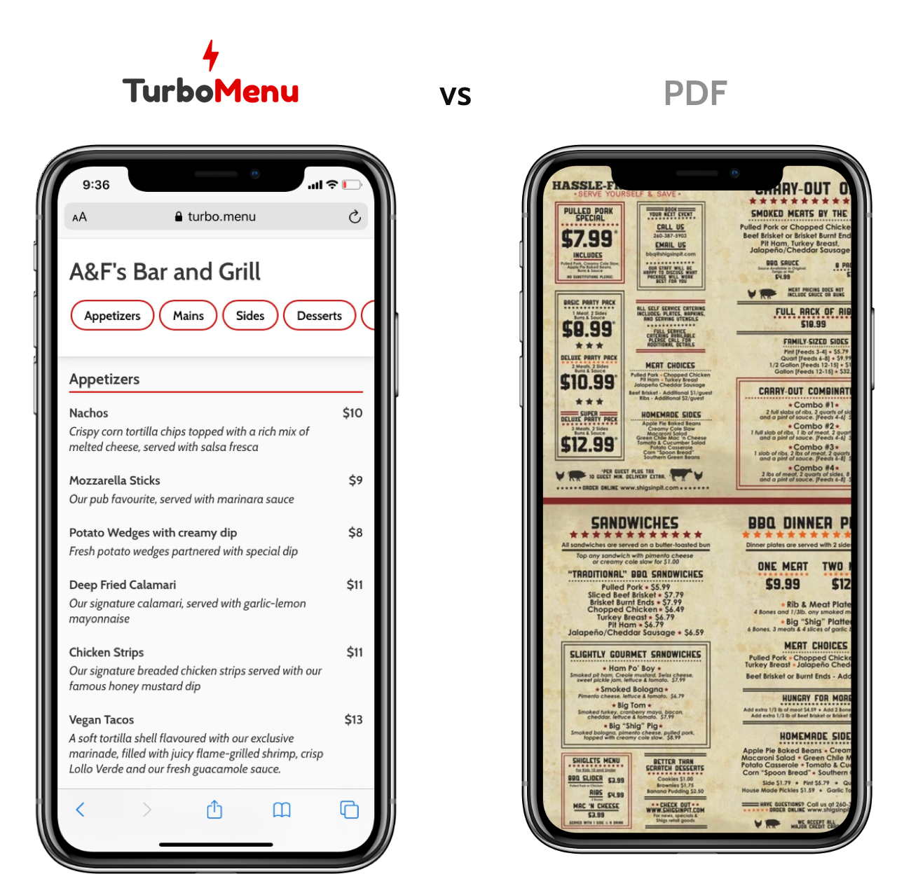 PDF menus are hard to read on a phone. With TurboMenu, your customers get a mobile-friendly version that loads fast.